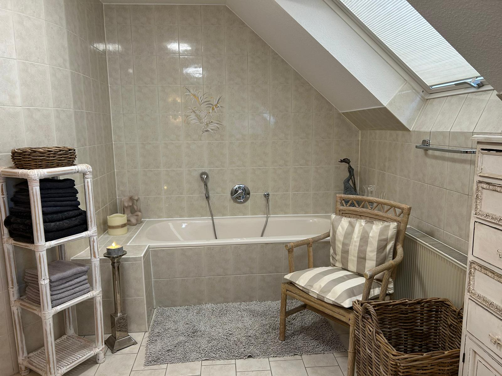 In den Bädern finden sich Handtücher in ausreichender Menge, ein Föhn sowie Duschhocker; in einem der Bäder steht zudem ein Waschtrockner zur Verfügung. In beiden Fluren, von denen die Zimmer abgehen, befinden sich Garderobenhaken und Spiegel.
