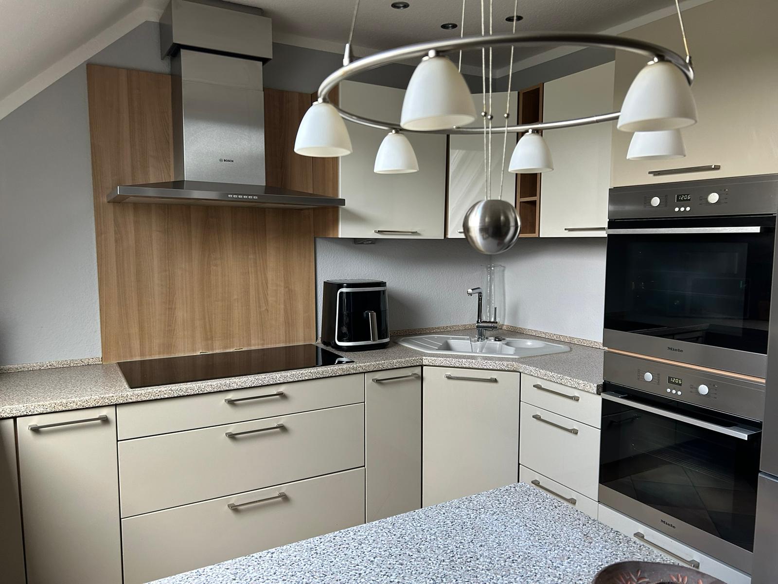 Die vorhandene Einbauküche ist vollumfänglich und modern ausgestattet mit Geschirrspüler, Kaffeevollautomat, Dolce‑Gusto‑Padmaschine, Heißluftfritteuse, Mikrowelle, zwei Backöfen, einem 90 cm breiten Cerankochfeld, Wasser‑ und Eierkocher, Entsafter, Toaster, Sandwichmaker, Waffeleisen, Kontaktgrill sowie einer großen Kühl‑/Gefrierkombination. Geschirr, Töpfe, Gläser und Besteck sind in ausreichender Menge vorhanden. Geschirrspültabs und Putzmittel sind inklusive.